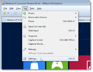Start your Windows 8 virtual machine in VMware Workstation. When you’ve logged into Windows 8, select Settings from the VM menu.